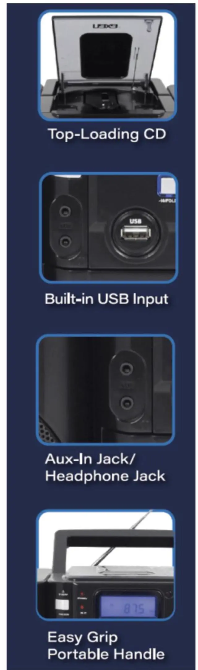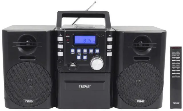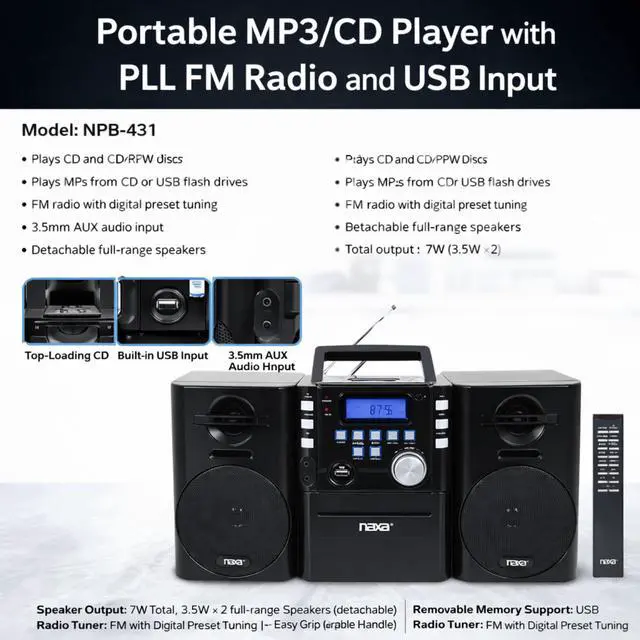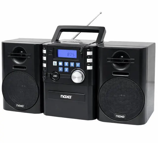 Take your music on the go with Naxa's Portable MP3/CD Player with PLL FM Radio and USB Input. It features a CD player and USB playback that is compatible with most of your MP3 players. You can also enjoy the PLL digital radio with 20 FM and 20 AM station presets. This portable boom box has a functional digital display for CD and radio as it is stylish with its high-gloss, black finish with metallic accents.