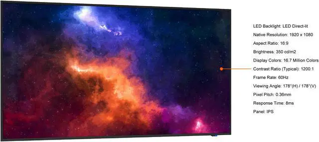 | Feature | Built-in NTSC/ATSC (8-VSP, Clear QAM) analog/digital tuner Variable picture modes (Dynamic Standard/Energy Savings/Theater/Custom) Advanced Video/Audio Settings Sleep Timer Built-In closed captioning Parental Control (V-Chip Function) Video Signal Wake-Up Function USB-C Port for Power Delivery Naviset Administrator 2 Compatible Integrated Speakers HDR Gamma |