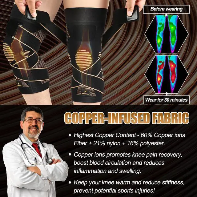 TARGETED RELIEF & SUPPORT Research shows that copper fiber material significantly reduce inflammation, swelling, and relieve muscle soreness. This copper knee brace disperse the pressure and improves circulation around your knee area, which will significantly effective reduce the pressure of the knee joint and help the meniscus to recover. Wrap around the patella to enhance the stability of the kneecap and relax tendons, avoid pulling, prevent muscle strain. GREAT for pain relief and recovery.