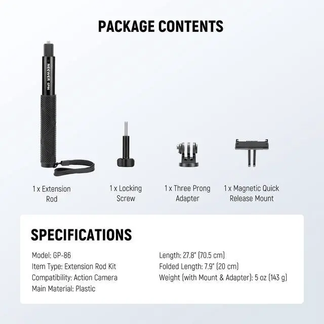 | Built-In Media | 1 x Extension Rod 1 x Magnetic Quick Release Mount 1 x Locking Screw |