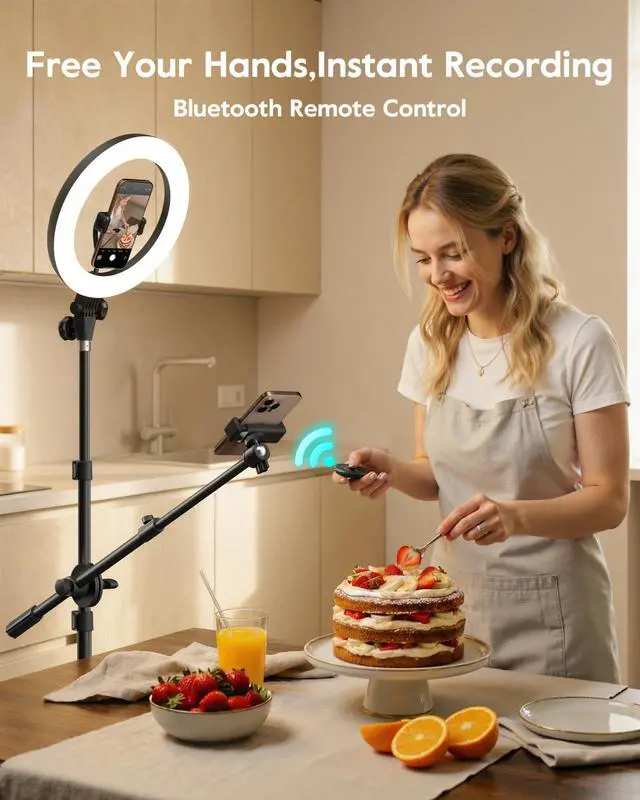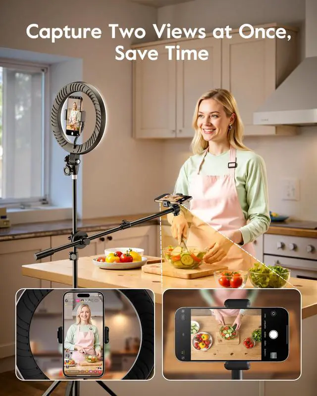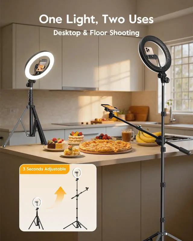 Not just a ring light with stand, but also a phone tripod with ring and overhead phone mount. Perfect for any side and overhead shooting.