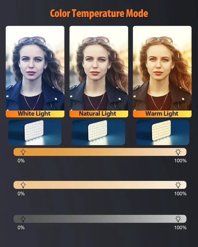 3 Light Modes & 10 Brightness LevelsThe selfie light has 3 Light Modes (White, Natural, Warm) from 2500K-6500K color temperature adjustable to meet all your needs, allowing you to be charming in any surroundings. Built-in 60 LED lighting beads with 10 levels brightness adjustable, compatible with phones, tablets, laptops, computers, tripods, and cameras. Works on TikTok, Facebook, YouTube, Twitter, Snapchat, FaceTime no matter indoor or outdoor, daytime or at night.