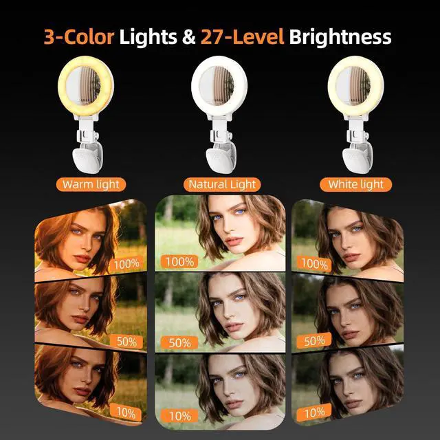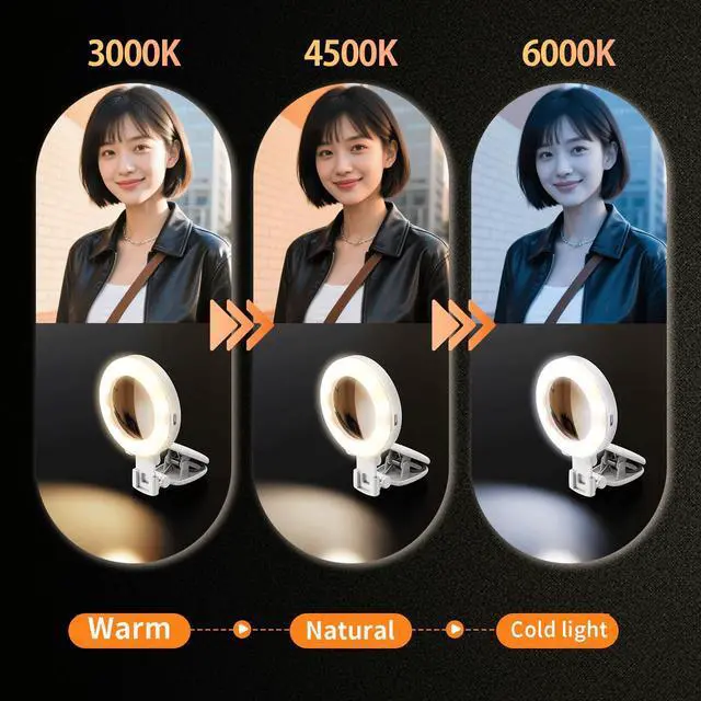 Pro-Level Lighting CustomizationWith 3 color temperatures and 3 brightness levels, it offers 9 professional lighting modes. You can freely switch between 3000K Warm, 4500K Natural, and 6000K Cool light, and fine-tune the brightness. This phone ring light ensures you get the ideal fill light in any environment, from dimly lit rooms to your bedside at night, helping you capture selfies and video recording content with natural skin tones and a superior look.