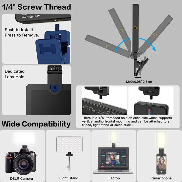 Compact and lightweight, this RGB video light fits easily in your pocket or bag for travel and daily use. A secure clip and 1/4? mount support phones, laptops, and cameras, with flexible 180° tilt and 360° rotation for fast setup wherever you shoot.