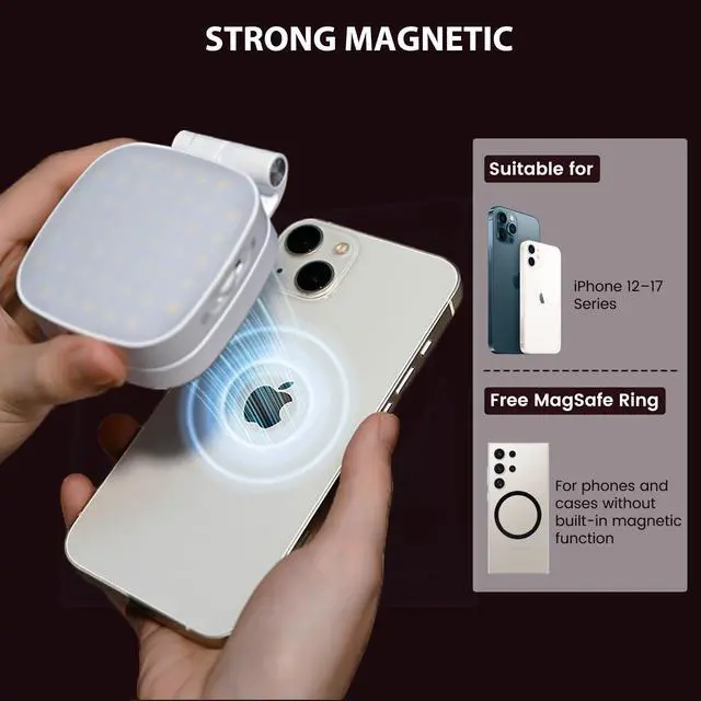 Strong Magnetic Hold: Snaps securely onto iPhone 1217 series with built-in MagSafe. A free magnetic ring is included for non-magnetic phones or cases, keeping your light firmly attached wherever you go.