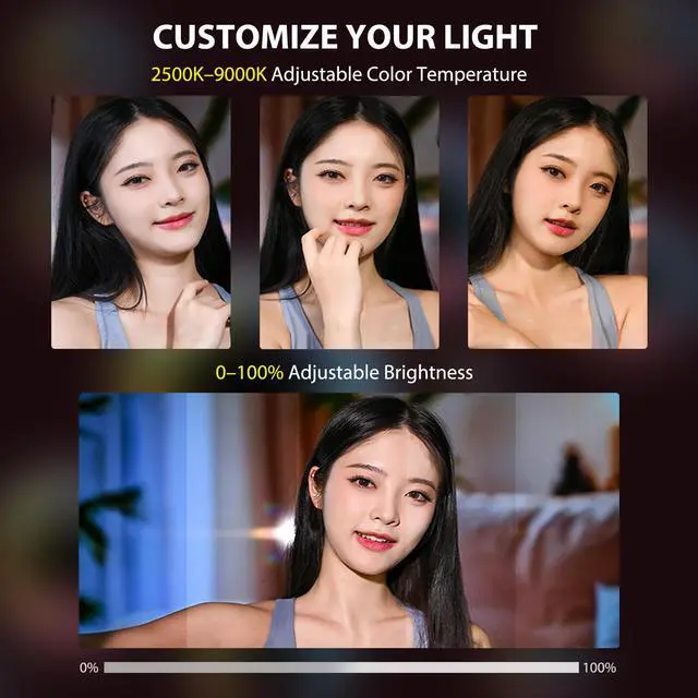 Infinite Brightness & Color Control: Adjust brightness from 0100% and color temperature from 2500K9000K to get the exact lighting you want for selfies, makeup, or video recording anytime, anywhere.