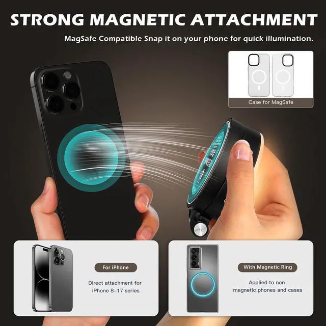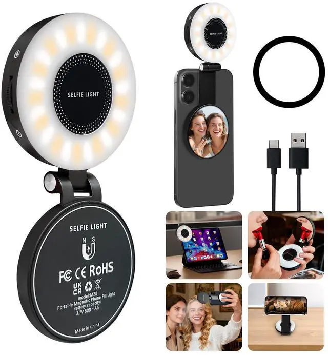 Portable Mini Magnetic Selfie LightPrielPaek 3-in-1 magnetic selfie light can firmly attach to magnetic or mental devices like smartphones, tablet cases with magnetic strips, or metal selfie sticks. For nonmagnetic devices, use the included adhesive magnet ring to mount it to Android phone or laptop for use. When folded, the dimensions are only 76.2x64.5x24.7mm and weighs only 108g, making it easy to fit into your pocket and an ideal accessory for shooting on the go.