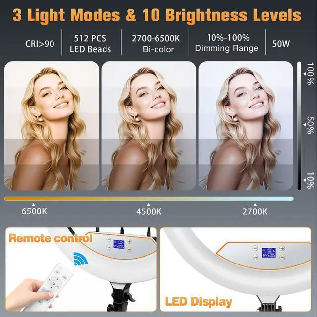 50W, CRI>90, 512LED Beads, Remote Control & Bluetooth & Touch Screen Control & 2USB Ports for Charging