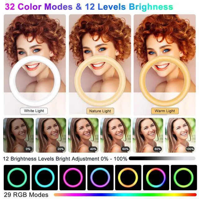 • 3 CCT Modes & 29 Color ModesSTALLY 10.2" ring light with stand and phone holder provides 3 CCT Modes: Warm light(3000K), Nature light(4500K), Cool white light(6500K)+ 29 RGB colors (red, green, blue, yellow, purple, cyan blue, color...). Brightness can be adjusted in each mode from 10%-100% with 12 levels. You can explore your favorite one or choose the one that best suits your mood, bringing you a truly wonderful lighting experience. High CRI for more accurate images.