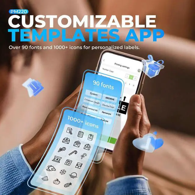 • Powerful APP- The PM220 label maker machine with tape comes with label templates and can set up your own templates. Please do not tear or destruct the green sticker on the back of the label strip, otherwise it will affect the printing effect. This label printer allows you to customize and format labels, supporting various features such as QR codes, barcode labels, tables, materials, time, figures, text, icons. This label maker machine with tape APP included more than 90 +Fonts, 14+ Languages, 450+ Materials