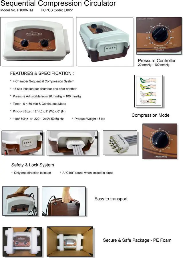 Air Sequential Compression Leg Massager - Half Leg Sleeve Complete Set (X-Large), 4 Chamber Sequential Compression Set (Pump + 2 Half Leg Garments + Bilateral Connector), ship to worldwide, Made in U. S. A., Air Compression Massage Mode, 15 sec inflation / deflation per chamber one after another / FDA 510K Medical Grade Device Approved / Overlapping Garment , Adjustable pressure range 20 ~ 100 mmHg, 60 min timer, Certificate of Calibration + - 1% Accuracy F. S. / Cytotoxicity Test, Delayed Hypersensitivity / Animal Skin Irritation Test Pass (ISO 10993-, 10) / Electromagnetic Compatibility, Electrical Safety Test PassGarment Circumference Measurements: Full Leg Garment Cover Size: (item: 1014N-S & 1014N-P) Large Ankle up to 18", Mid-Calf up to 21", Knee up to 25", Mid-Thigh up to 27, (Item: 1014NA-S, 1014NA-P,) Cover Size: Ankle up to 23", Mid-Calf up to 26", Knee up to 30", Mid-Thigh up to 34, (1014B-S,1014B-P) 33/34 X-Large Full Leg Garment, Cover Size: Ankle up to 19", Mid-Calf up to 23", Knee up to 25", Mid-Thigh up to 30,