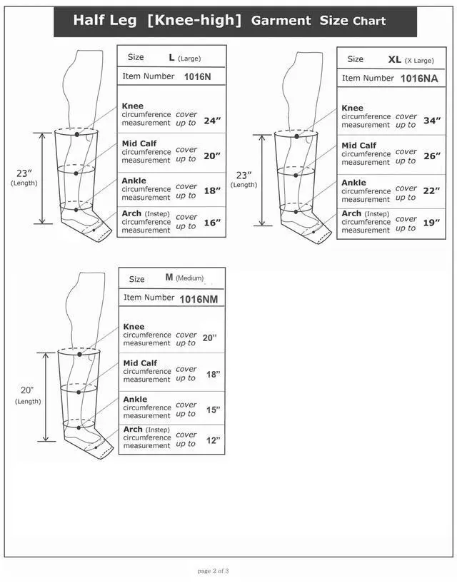 Half Leg Garment Cover Size: (item: 1016N-S & 1016N-P) Large Ankle up to 18", Mid-Calf up to 20", Knee up to 24 (Item: 1016NA-S, 1016NA-P) X-Large Half Leg Garment, Cover Size: Ankle up to 22", Mid-Calf up to 26", Knee up to 34