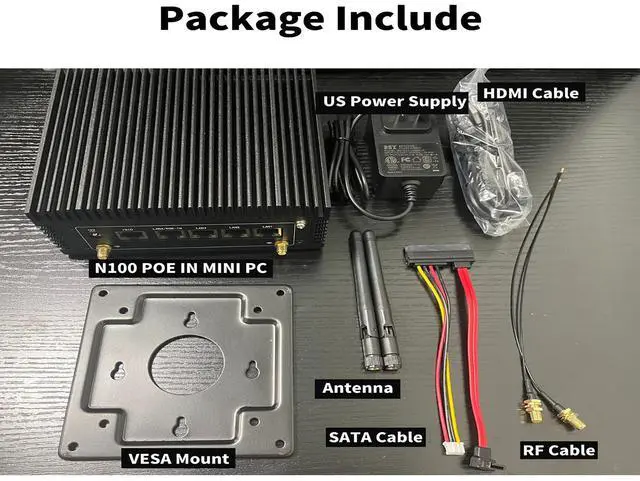 Packing List:N100 POE IN Firewall Appliance MINI PC,US Power Supply,HDMI Cable,RF Cable,SATA Cable,Antenna,VESA Mount(70x70/100x100mm)