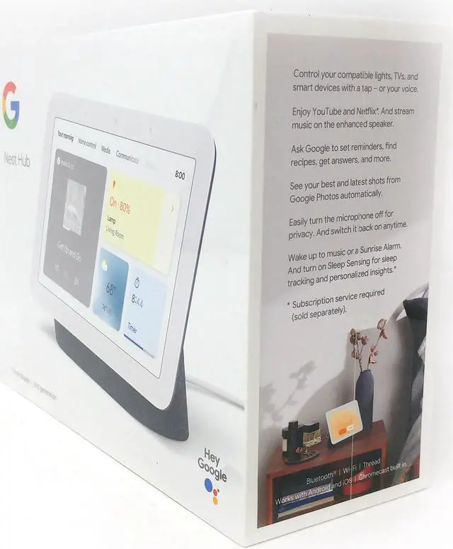 Control your smart home with thousands of compatible devices. Turn on lights, lock the doors, or turn up the thermostat with a tap. Nest Hub also works with Nest video doorbells and cameras. Just say, Hey Google, show me the front door camera to see your live feed.