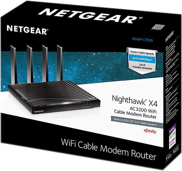 WIFI CABLE MODEM ROUTER Two-in-One-Ultra-high speed DOCSIS 3.0 Cable Modem + Nighthawk X4 WiFi Router No equipment rental fees-Save up to $120 a year 24x8 channel bonding technology enables extreme cable Internet speeds Supports XFINITY from Comcast Internet plans more STREAMING GAMING 3.2 Gbps WiFi speed delivers multiple HD videos with ease Quad-Stream WiFi-Enjoy multiple videos simultaneously ReadySHARE Vault PC software automatically backs up to USB hard drive connected to the router Connect USB 2.0 storage devices to store stream your own media Find play your stored media on TVs and game consoles using the built-in DLNA -ready server MOBILE Powerful amplifiers and four highperformance e...Broadband Transmission Technology: CableWireless LAN Standard: IEEE 802.11acISM Band: YesUNII Band: YesISM Maximum Frequency: 2.40 GHzUNII Maximum Frequency: 5 GHzNumber of External Antennas: 4Wireless Transmission Speed: 3276.80 Mbit/sNumber of Network (RJ-45) Ports: 4USB: YesPoE (RJ-45) Port: NoEthernet Technology: Gigabit EthernetVPN Supported: NoForm Factor: DesktopHeight: 7.5Width: 12.4"Depth: 10.4"Weight (Approximate): 3.75 lbPackage Contents: Nighthawk X4-AC3200 WiFi Cable Modem Router Ethernet cable Quick Start Guide Power adapter Package Contents Nighthawk X4-AC3200 WiFi Cable Modem Router Ethernet cable Quick Start Guide Power adapter "
