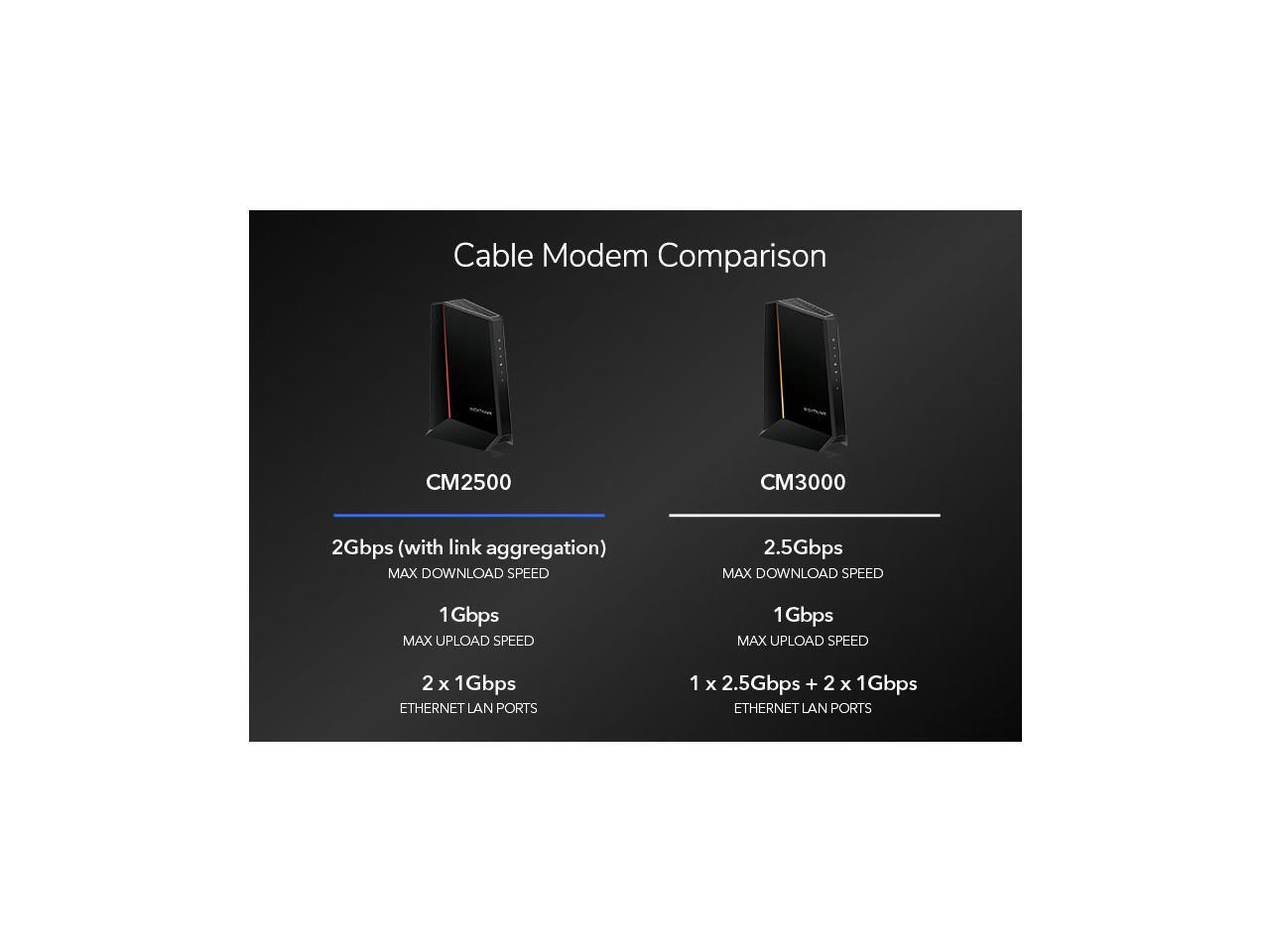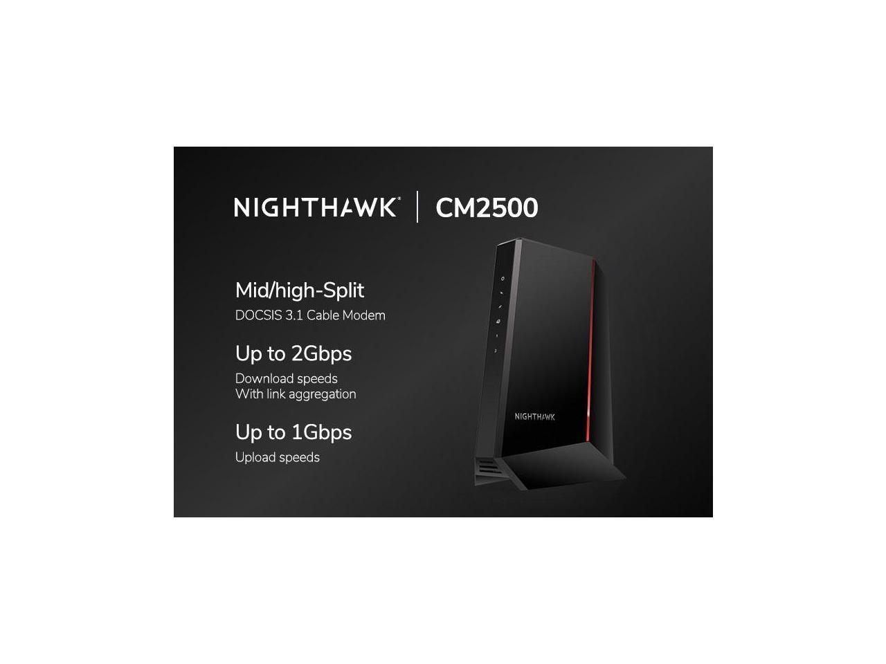 - The Nighthawk® CM2500 cable modem powers your digital lifestyle with download speeds up to 2Gbps and upload speeds up to 1Gbps for better capacity, efficiency, and response times