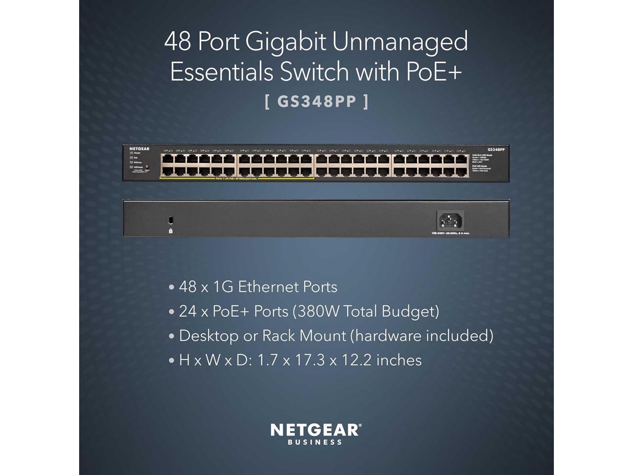 Netgear GS348PP 48-Port Gigabit Ethernet Unmanaged PoE+ Essentials Switch with 24-Ports PoE+ (380W), GS348PP-100NAS