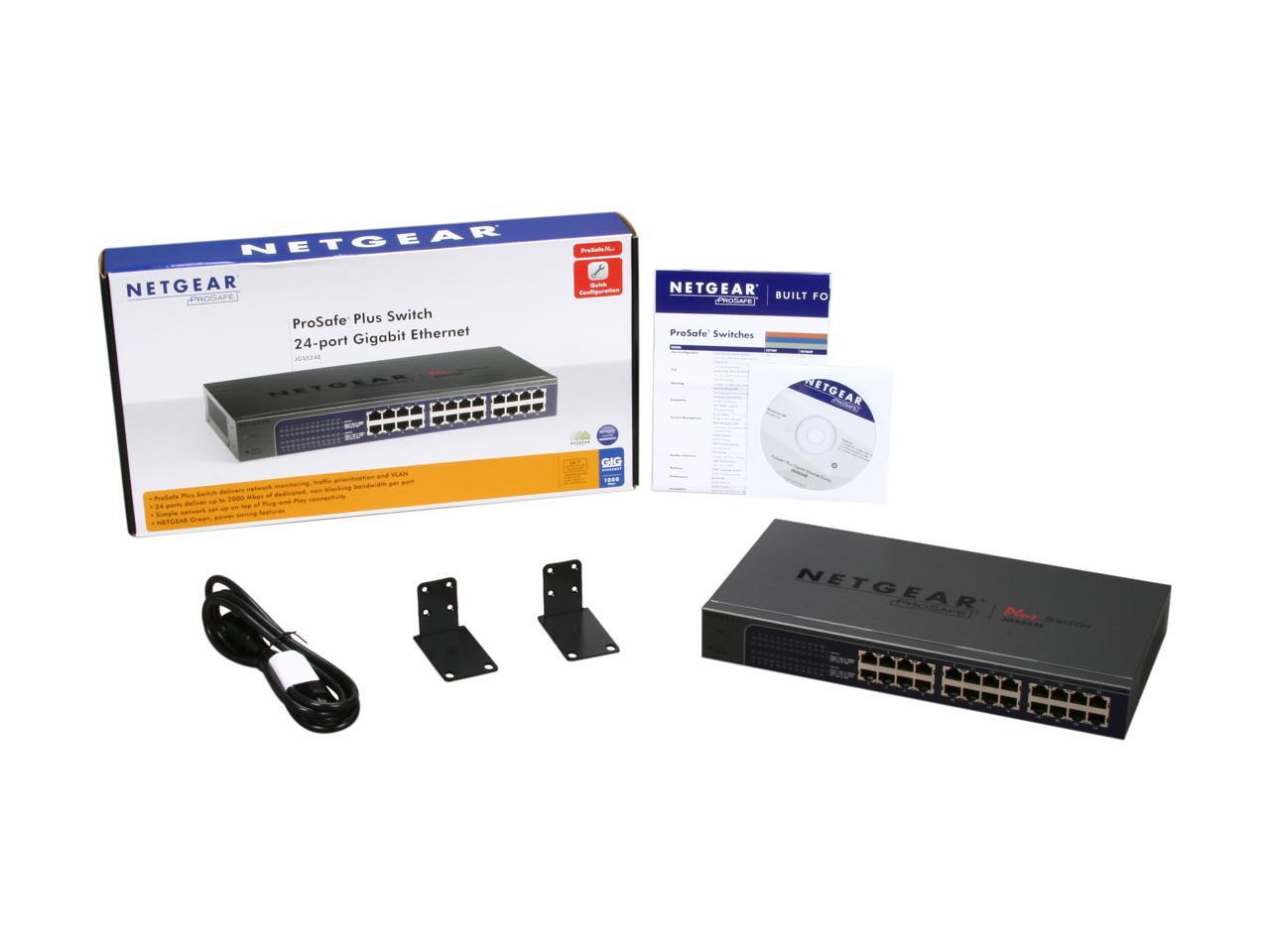 | Package Contents | ProSafe Plus Switch 24-port Gigabit Ethernet Switch (JGS524E) Rack-mount kit Power cord Quick Install Guide Installation CD with Configuration Utility software |