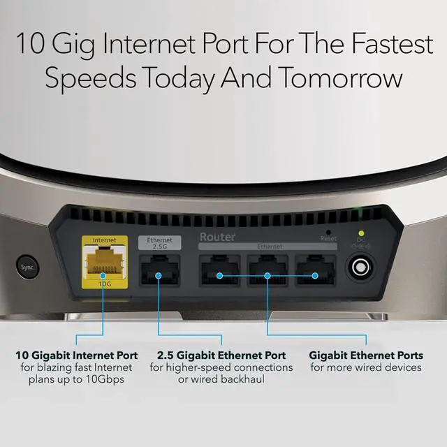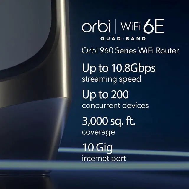 The Orbi 960 Quad-Band WiFi 6E Mesh-Ready Router, with the WiFi 6E "express lane" and a 10-Gig wired Internet port, delivers ultra-fast speeds and massive device capacity. With combined lightening-fast WiFi speeds of up to 10.8Gbps across up to 3,000 square feet, you'll enjoy the most amazing WiFi experience ever. Protect data, sensitive information, and devices with awardwinning NETGEAR Armor™ Internet security.