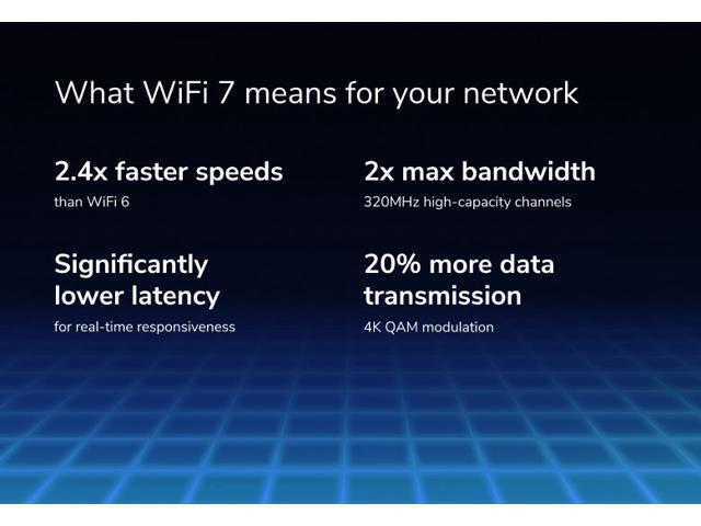 - WiFi 7 delivers 1.2x faster speeds than WiFi 6 to maximize performance across all devices