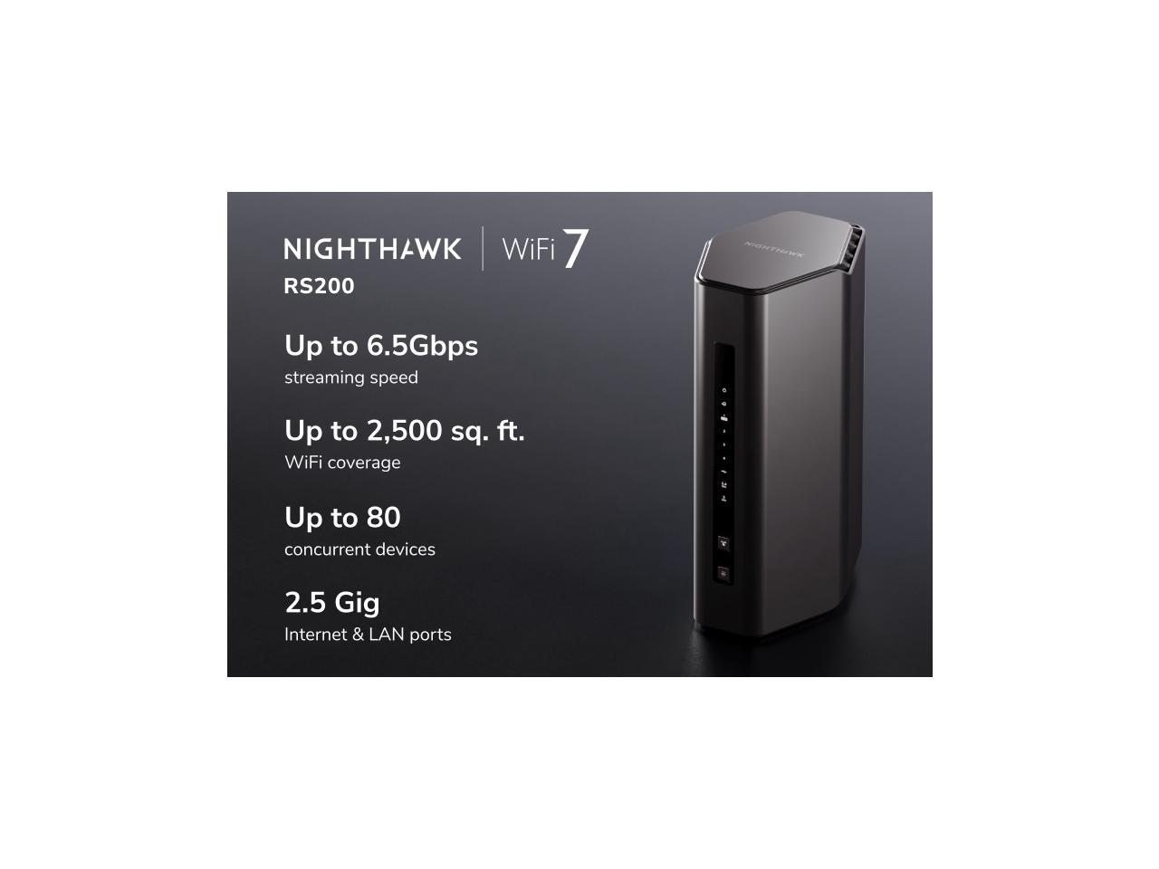 - Leverage the power of WiFi 7 for speeds up to 6.5Gbps at 20% faster than WiFi 6. The Nighthawk® RS200 WiFi 7 Dual-band Router provides up to 2,500 sq. ft. WiFi coverage and capacity for up to 80 devices. Experience stunning 4K streaming, video conferencing and reliably connect smart home devices. NETGEAR Armor protects your family’s WiFi by creating an automatic shield for all connected devices.