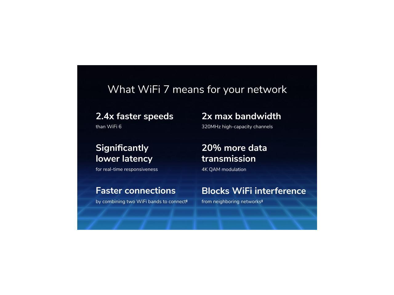 - Multi-Gig WiFi —Blazing-fast WiFi 7 speeds up to 6.5Gbps† for gaming, smooth streaming, video conferencing, and entertainment.