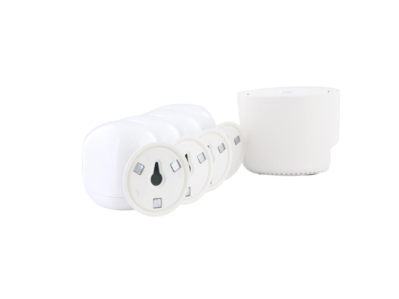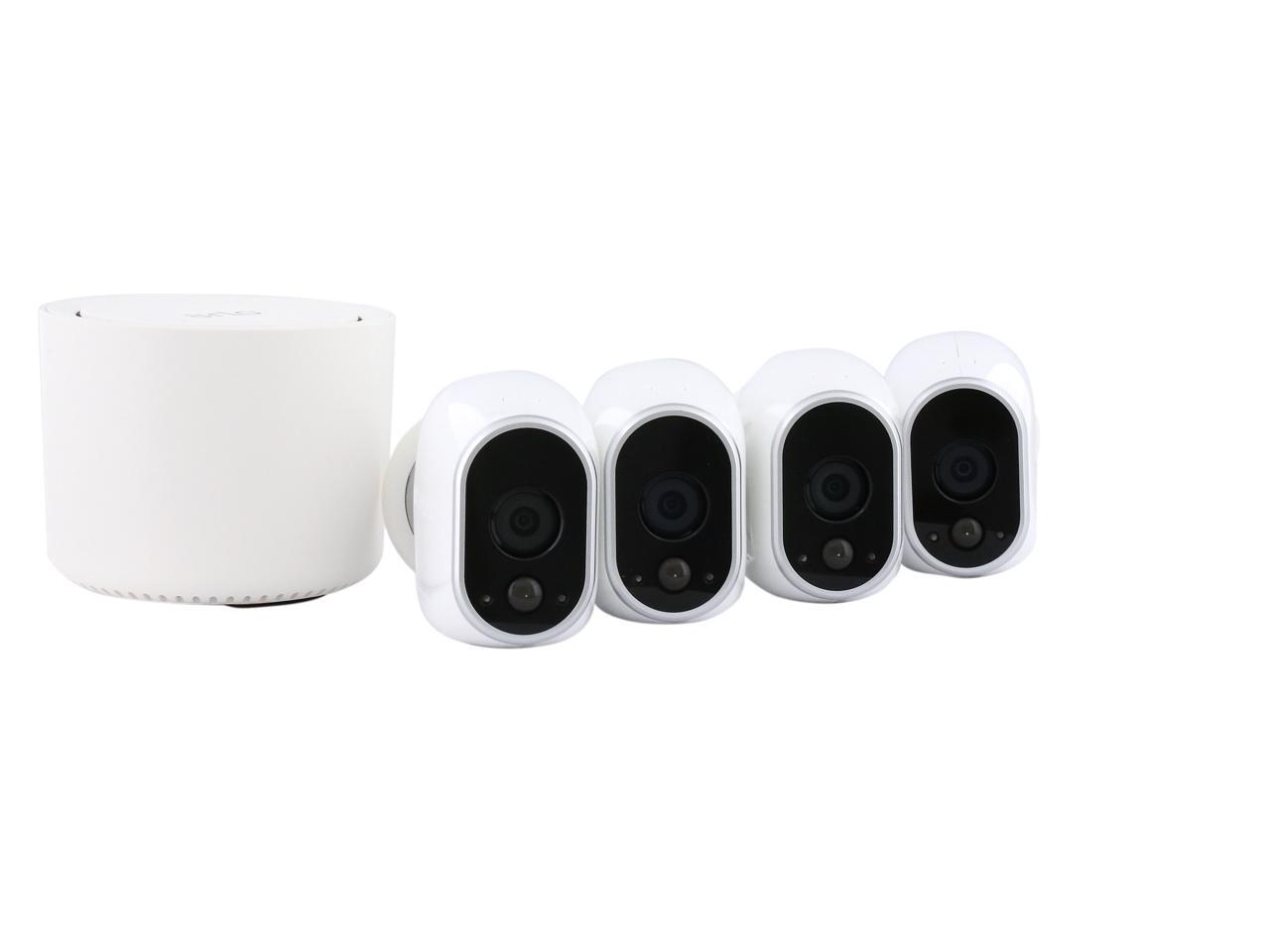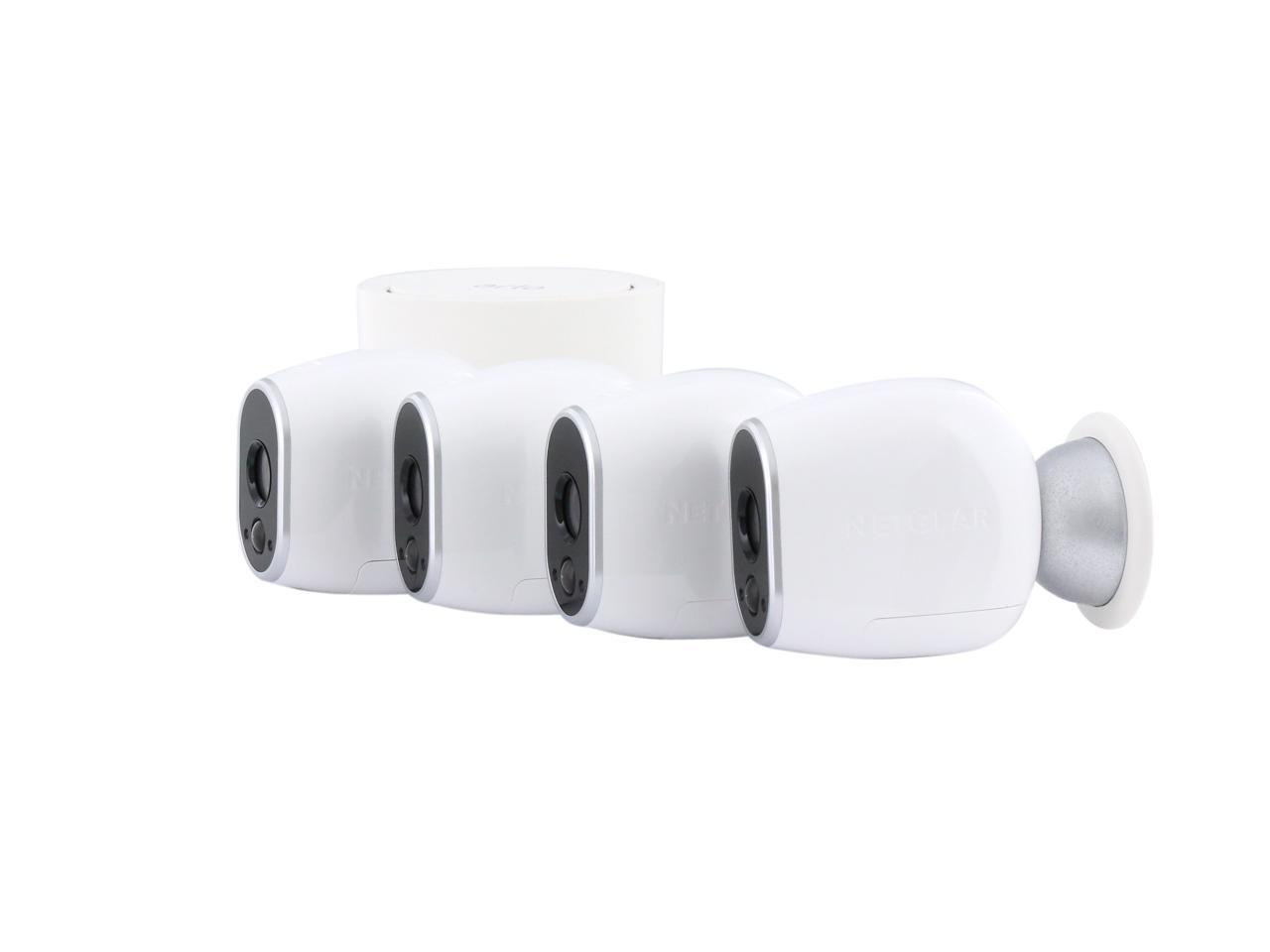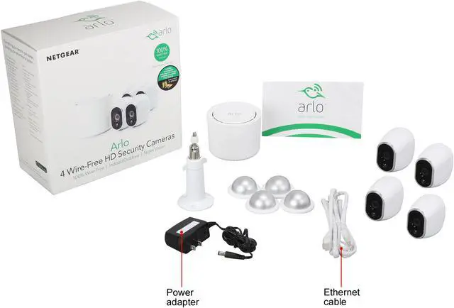 | Package Contents | (4) Arlo smart security cameras (1) Smart home base station with power adapter (1) Ethernet cable (4) Wall mounts (1) Outdoor security mount (7) Mounting screws (16) Batteries (1) Quick start guide (1) Window decal (7) Days of FREE cloud recordings |