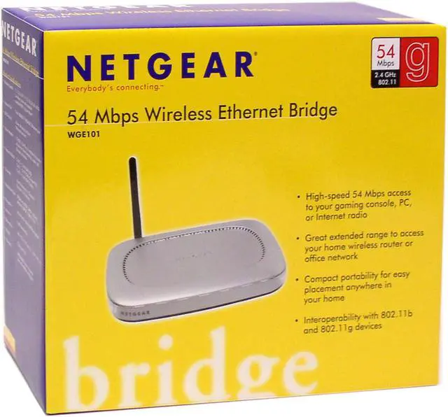 | Features | Blanket coverage – none of the dead spots that other 802.11 devices might have Detachable antenna – gain better range and signal flexibility by positioning the antenna where you would like Multiple device recognition – connect to a switch and attach many devices to your WGE101 |