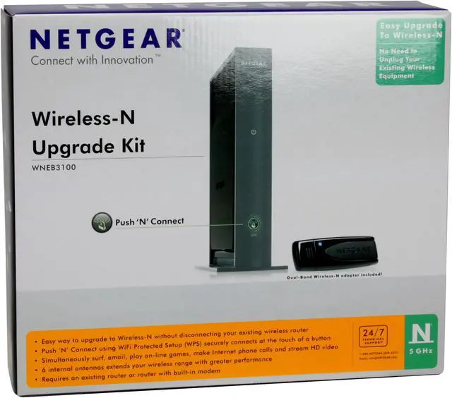 | Features | Easy plug-and-play upgrade to Wireless-N for your existing broadband network Included USB adapter boosts wireless performance to a desktop or laptop PC Notebooks with embedded Wireless-N connect at highest possible Wireless-N speeds Automatic Quality of Service (QoS) ensures superior voice, video and gaming applications More wireless channels, less interference and better connections using 5 GHz Wireless-N band Push ‘N’ Connect using WiFi Protected Setup (WPS) with no passwords to remember |