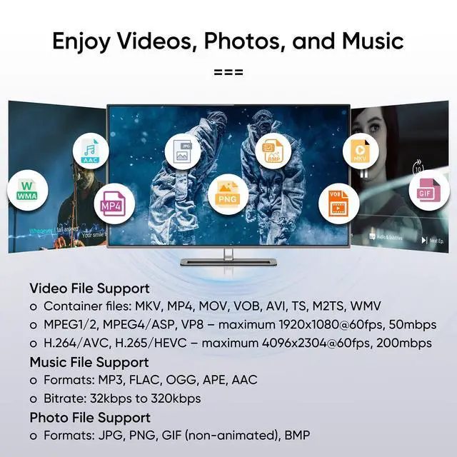 Video: MP4, MKV, AVI, TS/TP, MOV, VOB, and M2TS files using H.265/HEVC, H.264/AVC, VC1 or MPEG2/4 codecs, up to 4096x2304p@60fps resolution, 10-bit color, and 250mbps