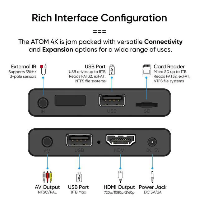 Simply copy your videos, photos, or music files onto a USB drive or an SD card, insert it into the ATOM 4K, and you are ready to play those files using an easy-to-navigate menu. Got a lot of media files? No problem! The ATOM 4K can read USB drives up to 4TB or Micro SD cards up to 512GB. Popular file systems are supported, including FAT32, exFAT and NTFS.