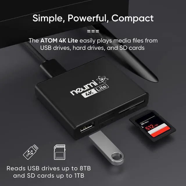 The NEUMI ATOM 4K Lite is the easy and affordable way to add video, photo, and music playback to any TV, new or old. Just attach a USB drive or SD card with your media files, select a file, and play! It is simple and intuitive to use with no complicated settings or controls. Turn on its automatic playback and resume capability and you wont even need to pick up the remote.