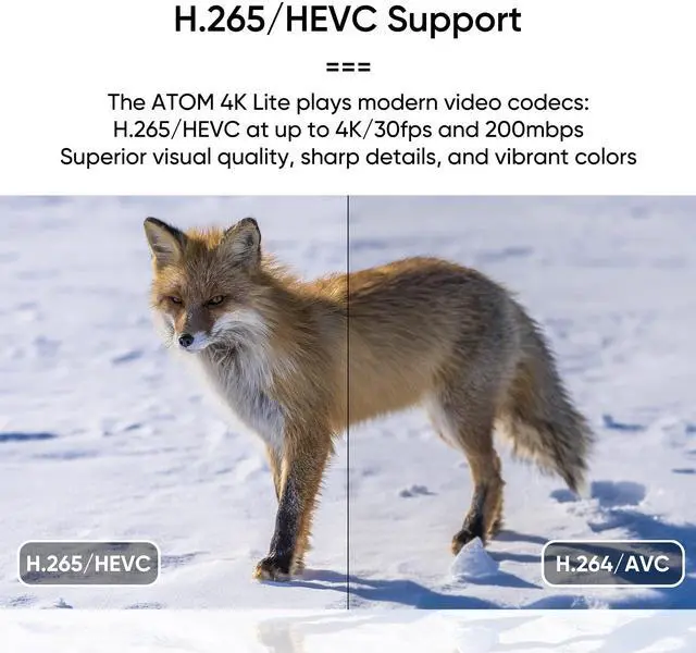 The ATOM 4K Lite offers stunning video quality through its HDMI output that supports up to 2160p/60Hz resolution, with support for the latest video formats such as H.265/HEVC. It can feed digital surround sound to your home theater receiver for a cinema-like listening experience. Additionally, the ATOM 4K Lite provides analog AV output for connecting to an older TV, or for sending audio to a stereo system.