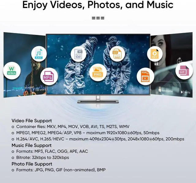 Video: MP4, MKV, AVI, TS/TP, MOV, VOB, and M2TS files using H.265/HEVC, H.264/AVC, VC1 or MPEG2/4 codecs, up to 4096x2304p@30fps resolution, 10-bit color, and 200mbps