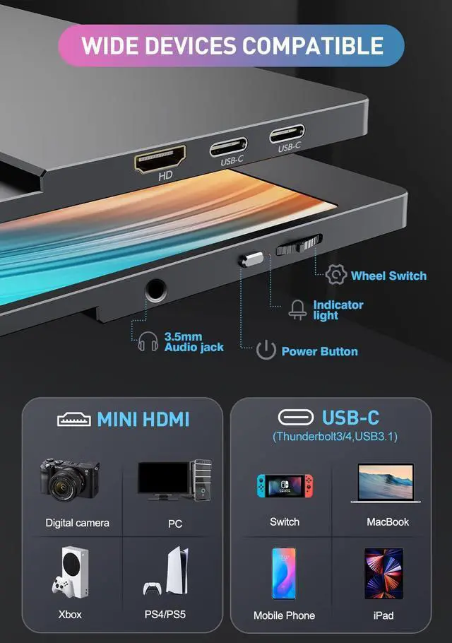 [Wide Compatibility] Thanks to two USB-C ports and one mini HDMI port, this 18.5" portable monitor can be connected to a variety of devices such as PC, laptop, smartphone, gaming devices like Switch, Xbox, PS3/4/5 and so on. Please note that if your device's