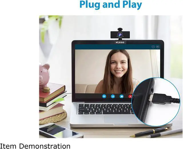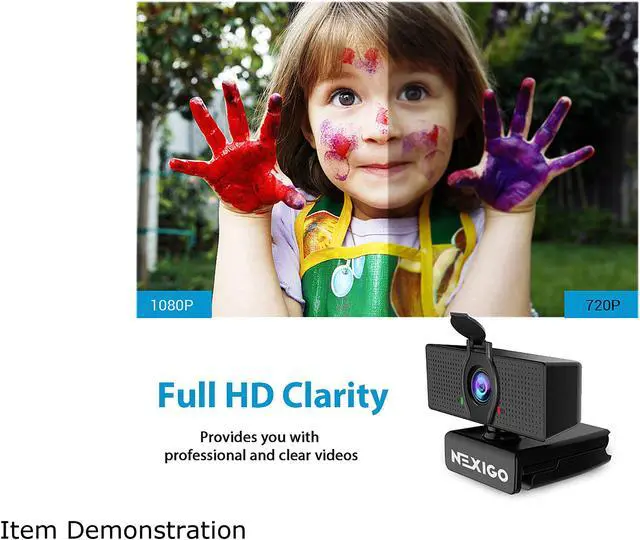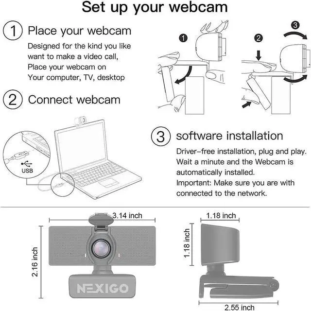 | Features | 1080P Full HD Webcam The NexiGo PC Webcam can provide you with excellent video quality with live streaming and record up to 1080p at 30 frames per second. Noise-Cancelling Technology Great for webinars, video conferencing, live streaming, etc. The built-in Noise-canceling microphone reduces ambient noise to enhance the sound quality of your video. Even in noisy surroundings, you can capture the sounds you want. 360 Degree Adjustable Rotation With the NexiGo webcam, you don't need to turn your laptop to record what you want, just turn your webcam. With a built-in 360° rotation both right and left, you can easily move the camera to any angle you need. Easy to Set Up Webcam Privacy Cover: 1. Clean your device camera surface 2. Remove the back tape 3. Stick the webcam cover over the camera 4. Press firmly and hold for seconds |