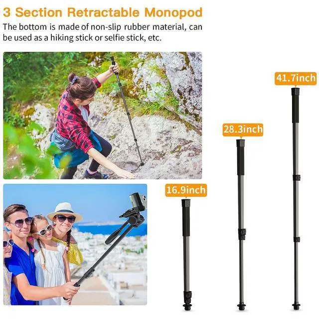* Multi-function tripod can be used as a monopod, selfie stick, or walking stick.