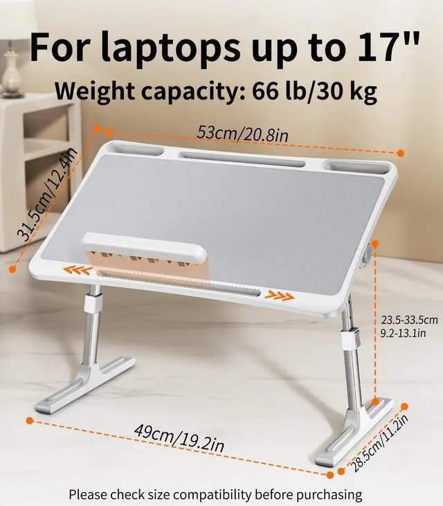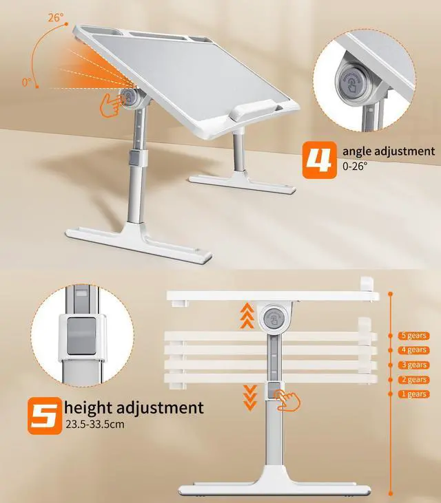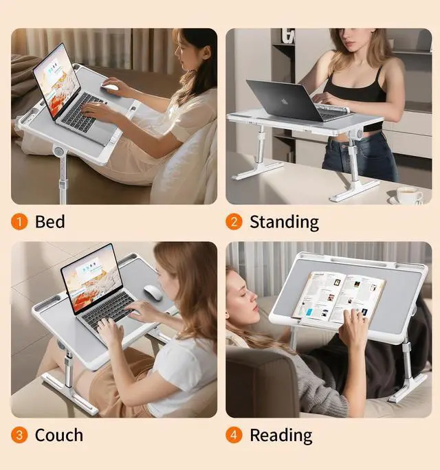HEIGHT ANGLE ADJUSTABLE: This laptop bed tray desk supports different angles and height adjustments, you can adjust the desktop to the right position for different scenarios to relieve eye, back and neck fatigue. You can also put the computer desk on the desktop to turn it into a standing desk for standing work.