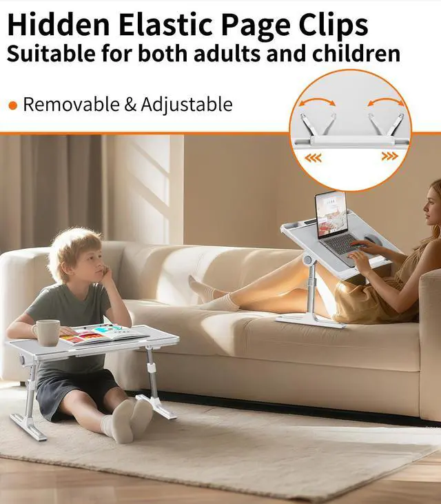 MULTIFUNCTIONAL FLAP: The panel of laptop stand for bed is equipped with a removable flap, which can effectively prevent the computer and tablet from falling. At the same time, there is a hidden elastic page clips, which can be used for reading and studying. When you don't need to use the flap, you can directly remove it and use the small writing desk without any obstacles.