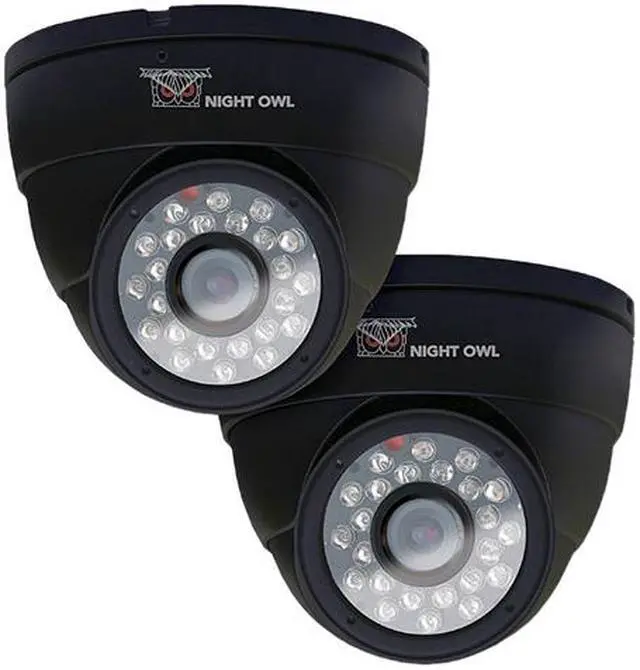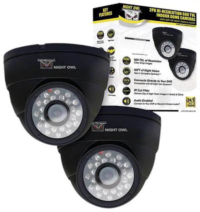 2PK Hi-Resolution 600 TVL Indoor Security Dome Cameras with 50FT of Night Vision and Audio Night Owl's CAM-2PK-DM624-BA is a 2 pack of Black indoor hi-resolution security Dome cameras that provide clear and crisp images at 600 TV lines of resolution.