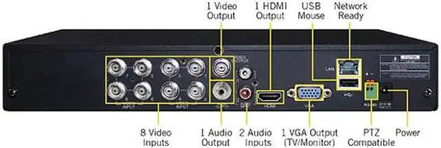 The DVR easily connects to multiple TVs or Monitors with the convenience of three video outputs for instant viewing. The DVR is equipped with 1 BNC, 1 VGA and 1 HDMI video output giving way for coverage over a larger square footage as with homes/small businesses. For your convenience we have included a 6 ft. HDMI cable.