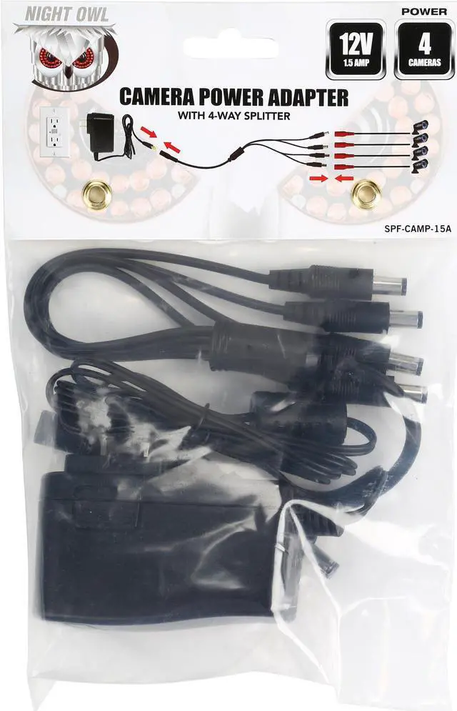 Night Owl's SPF-CAMP-15A is a Camera Power Adapter with a 4-way power splitter, which will allow you to easily power up to 4 security cameras. Now you can guarantee your cameras will always be connected, escaping the chance of missing out on any suspicious activity!Device Supported: CameraUniversal Adapter: YesMultiple Power Tips: YesInput Voltage: 12 V ACMaximum Output Current: 5 AWidth: 1.8Depth: 2.6"Weight (Approximate): 4.80 ozPackage Contents: Camera Power Adapter With 4-Way Power Splitter 1 Package Contents Camera Power Adapter With 4-Way Power Splitter 1 "