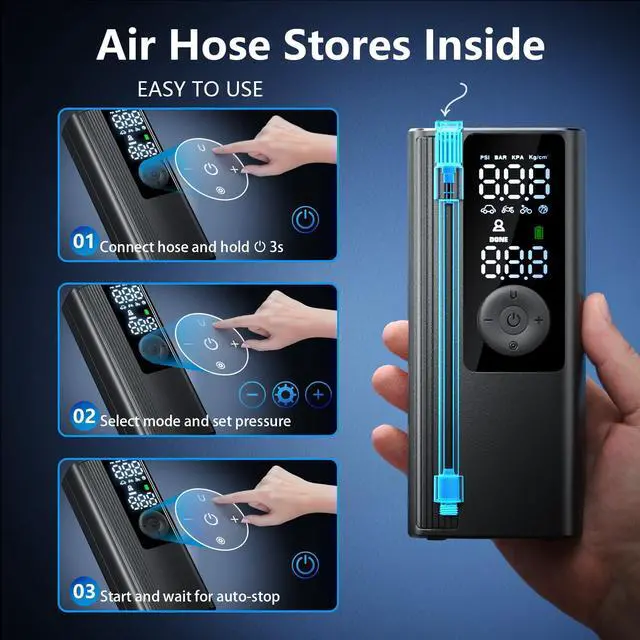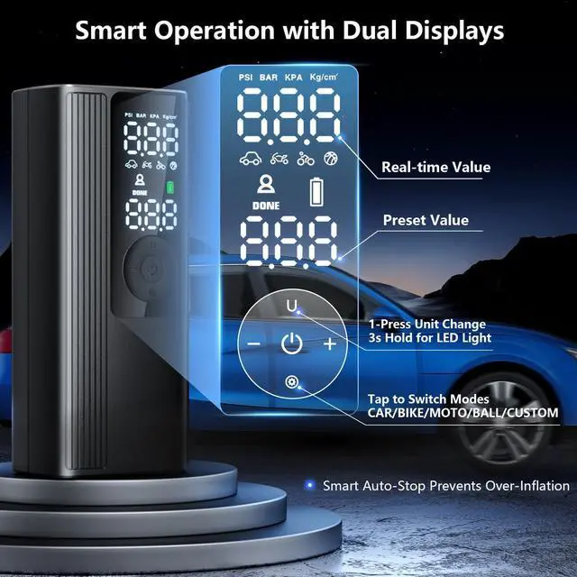- 5 Modes for Inflation Needs: Like an all-in-one air station, the portable air pump has four preset modesfor Car, Motorcycle, Bicycle, and Ballso you can quickly pick the right one. Each mode sets the best pressure for you automatically. Want to set your own pressure? Use the Custom Mode and set any number you like. You can easily switch between PSI, Bar, kPa, or kg/cm² units with "U" button. Whether it's SUV tires, bicycle tires, soccer balls, or swimming rings, this tire inflator portable air compressor makes inflation simple and precise.