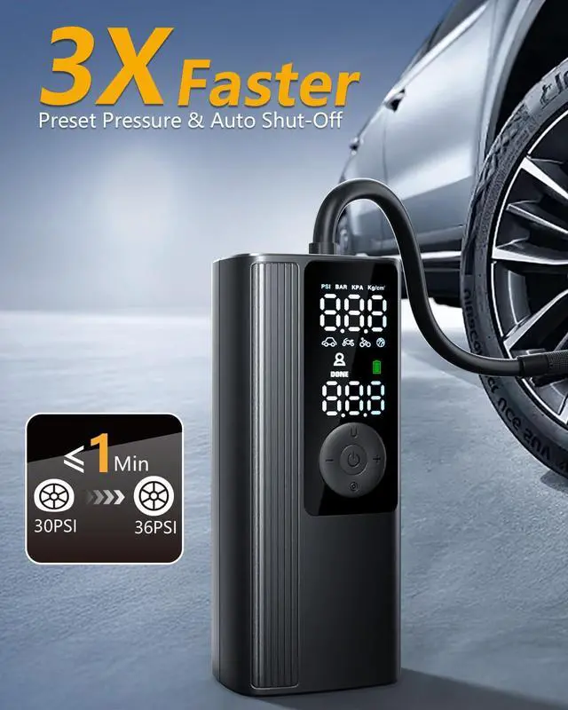 Experience 3X faster inflation with our powerful portable air compressor! Designed for car, pickup, motorcycle, bicycle, and ball use, this cordless pump delivers 150 PSI max pressure and refills a standard car tire (3036 PSI) in just 1 minute no more waiting around.