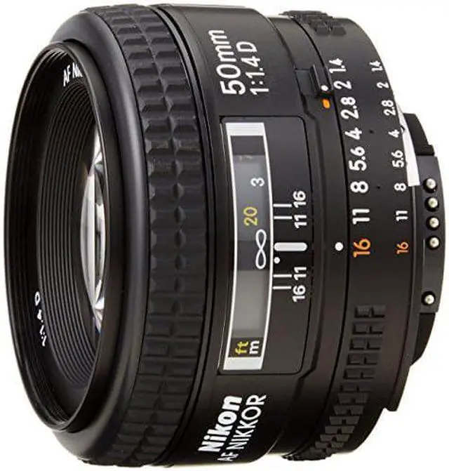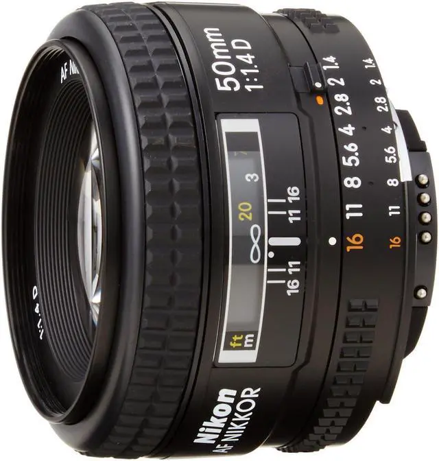 Fast enough for shooting in just about any type of light, this is an ideal first lens; perfect for full-length portraits, travel photography or any type of available-light shooting. The Nikon 50mm f/ 1.4D AF Nikkor lens delivers distortion-free images with superb resolution and color rendition. Accepts 52mm filters. For programmed auto or shutter-priority auto shooting, use the minimum aperture lock lever to lock the lens aperture at f/16