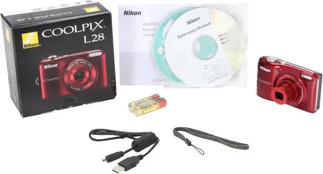 Nikon COOLPIX L28 Digital Camera UC-E16 USB Cable Two AA Alkaline Batteries AN-CP19 Strap NikonView NX 2 CD-ROM