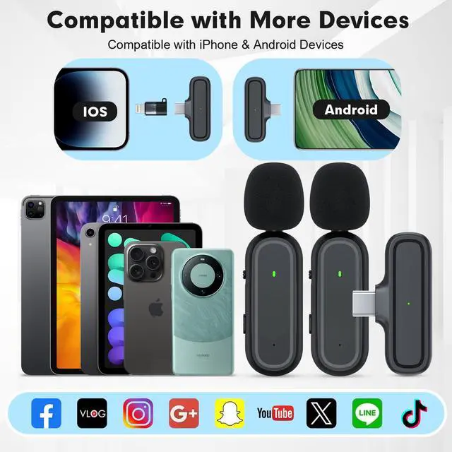 True Plug-and-Play - 1-Second Setup for 2-Person Recording Simply plug the Lightning/USB-C connector into your iPhone, iPad, or Android device, clip the lavalier mics onto shirtsstarts working in 1 second, no apps/drivers needed! This 2-pack mini wireless mic supports simultaneous dual-person recording, perfect for content creators: YouTube, vlogs, TikTok, podcasts, live streams, Zoom meetings, interviews, online classes, and singing recordings. Ideal for remote workers, influencers, and educatorshassle-free setup, no technical skills required.