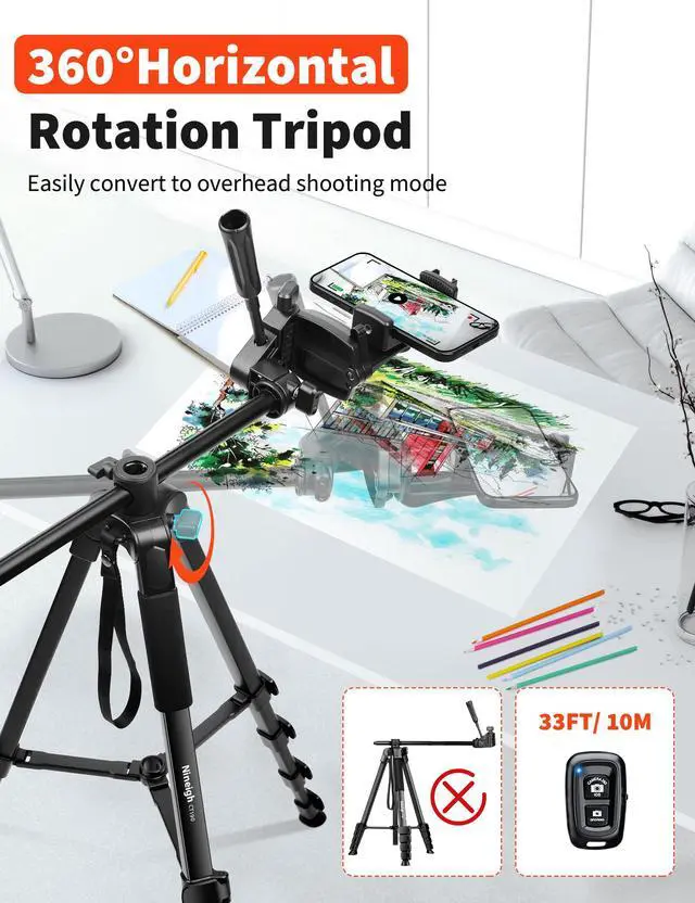 Features aluminum and plastic integrated molding for durability and stability. Tripod supports vertical, panoramic, and overhead shooting, converts seamlessly between phone/camera/overhead tripod. Ideal for photography, group photos, videos, and live streaming