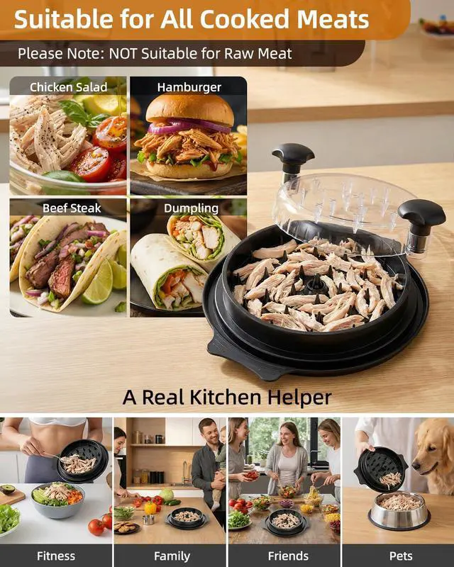 YOUR VERSATILE KITCHEN HELPERIdeal for fitness meals, BBQs, taco nights, and more! Efficiently shred chicken, pork, beef, and vegetables for enchiladas, salads, casseroles, or pulled pork. Its also perfect for pet owners to prepare fine shredded meat for pet food. A thoughtful and practical gift for anyone who loves to cook.