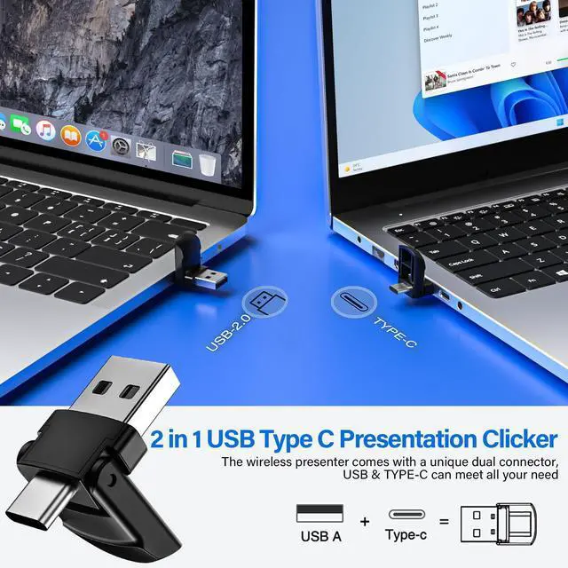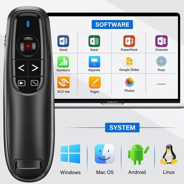 Wireless presentation clicker for powerpoint presentations supports the systems: Windows 2003/XP/Vista/7/8/10/11, MacOS, Linux, Android.